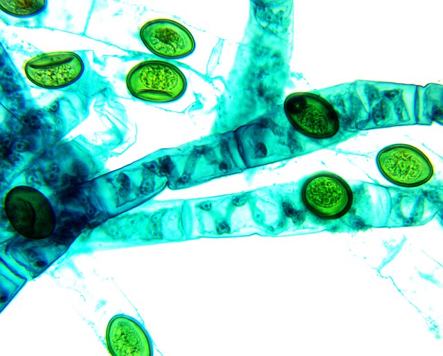 Спирогира, вид зеленых водорослей, при 1000-кратном увеличении